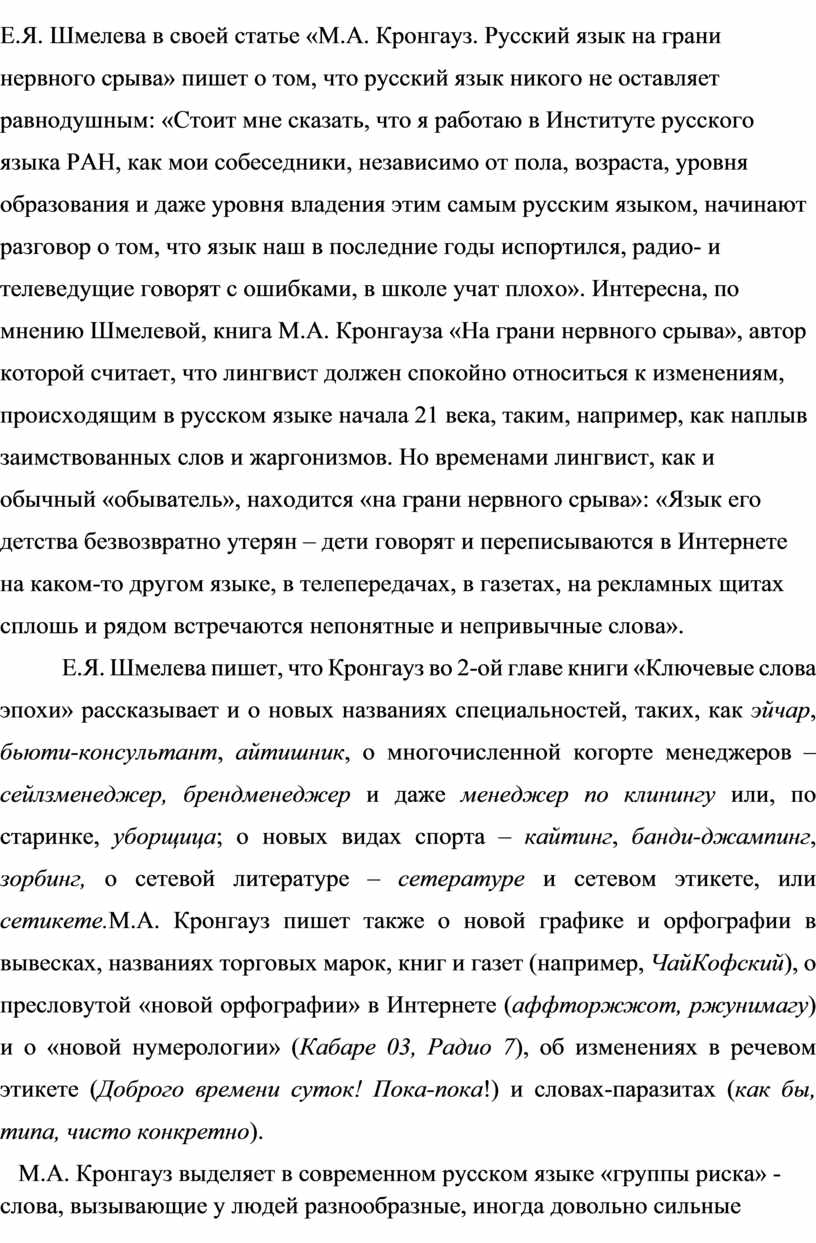 Е.Я. Шмелева в своей статье «М.А. Кронгауз. Русский язык на грани нервного срыва» пишет о том, что русский язык никого не оставляет равнодушным: «Стоит мне сказать, что я работаю в Институте русского языка РАН, как мои собеседники, независимо от пола, возраста, уровня образования и даже уровня владения этим самым русским языком, начинают разговор о том, что язык наш в последние годы испортился, радио- и телеведущие говорят с ошибками, в школе учат плохо». Интересна, по мнению Шмелевой, книга М.А. Кронгауза «На грани нервного срыва», автор которой считает, что лингвист должен спокойно относиться к изменениям, происходящим в русском языке начала 21 века, таким, например, как наплыв заимствованных слов и жаргонизмов. Но временами лингвист, как и обычный «обыватель», находится «на грани нервного срыва»: «Язык его детства безвозвратно утерян – дети говорят и переписываются в Интернете на каком-то другом языке, в телепередачах, в газетах, на рекламных щитах сплошь и рядом встречаются непонятные и непривычные слова».