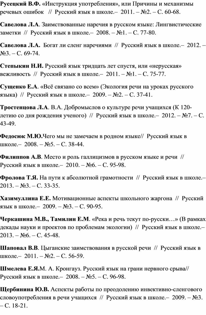 Русецкий В.Ф. «Инструкция употребления», или Причины и механизмы речевых ошибок // Русский язык в школе.– 2011. – №2. – С. 60-68.