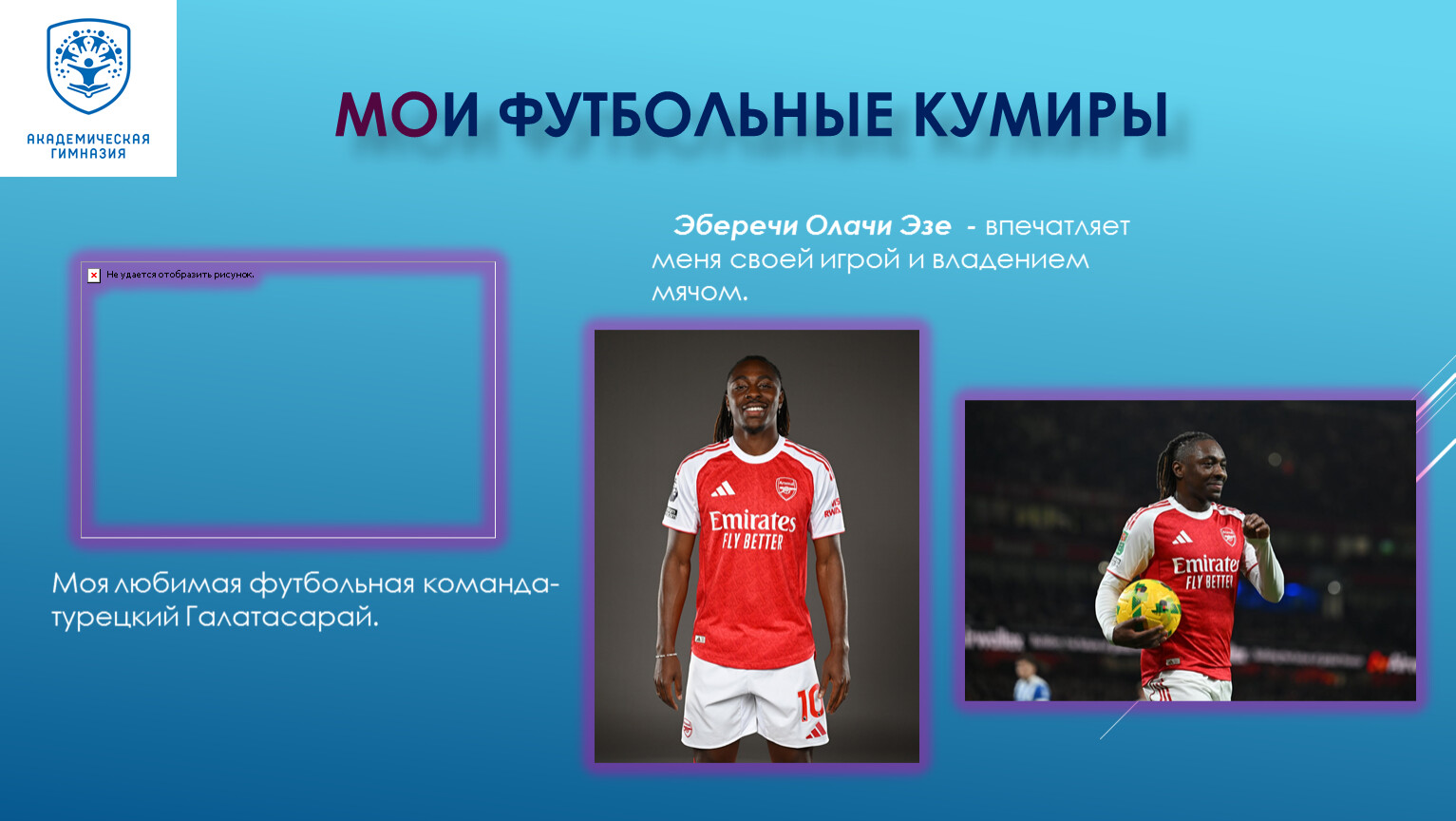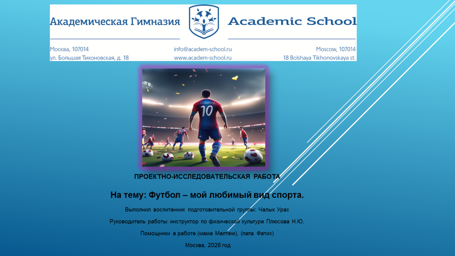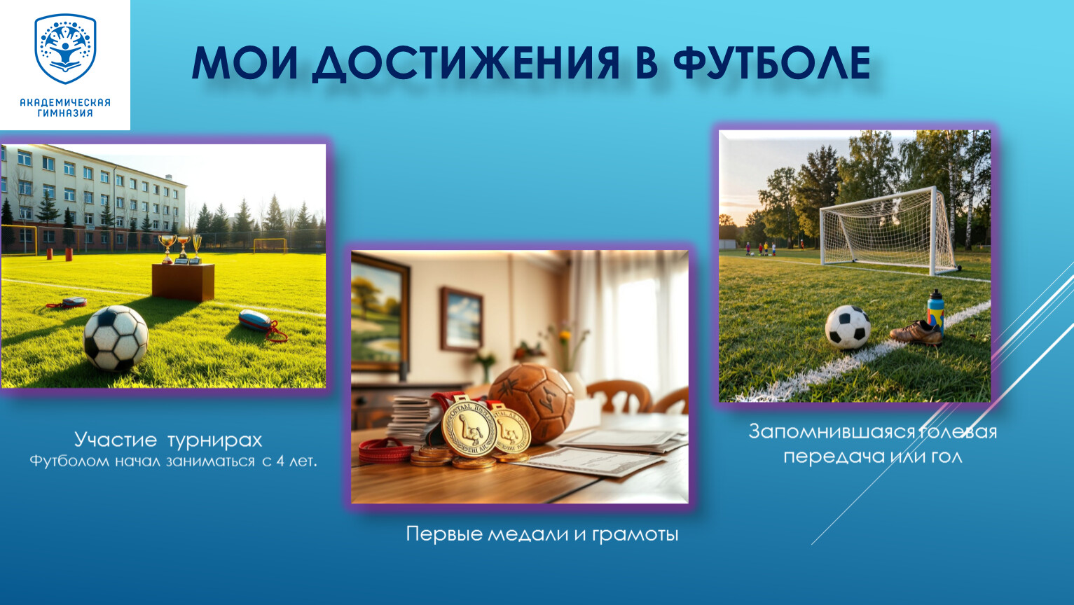Футбол привлекает меня своей командной игрой. Игра учит меня быть сильным, радоваться общим победам и достижениям.