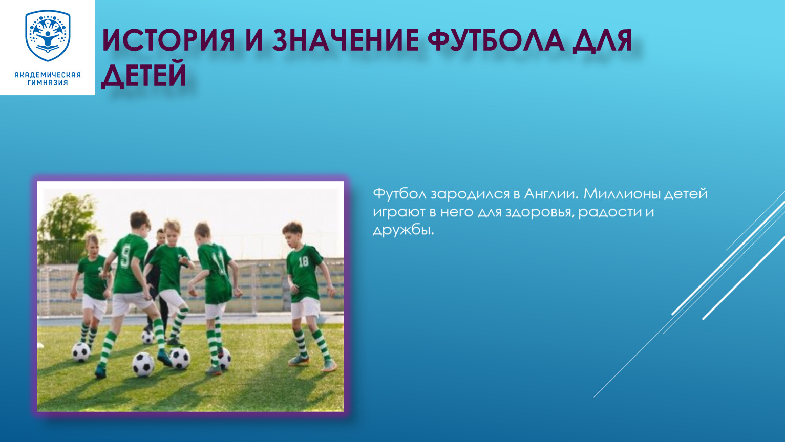 Футбол зародился в Англии. Миллионы детей играют в него для здоровья, радости и дружбы.