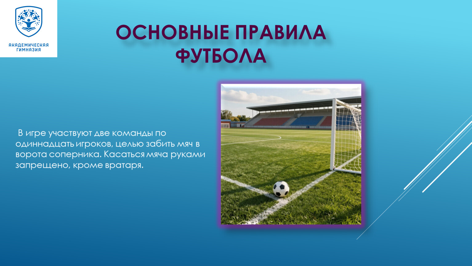 В игре участвуют две команды по одиннадцать игроков, целью забить мяч в ворота соперника. Касаться мяча руками запрещено, кроме вратаря.