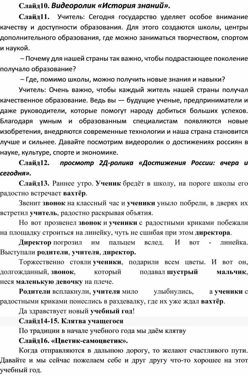 Я рада видеть вас здоровыми, красивыми. Наступила осень. И мы опять стоим на пороге нового учебного года. Из года в год 1 сентября наша школа приветливо открывает нам свои двери. Сегодня мы вновь собрались все вместе и отправляемся в увлекательное, интересное, хоть порой и трудное путешествие по Стране Знаний. Этой страны вы не найдете ни на одной карте или глобусе, ее там нет. Эту страну предстоит открывать вам самим с помощью учителей. От вас самих зависит, кем вы станете: знайками или незнайками. Поздравляю вас с началом нового учебного года и желаю, чтобы он был для вас успешным, желаю учиться на 4 и на 5, желаю усидчивости, выносливости, ответственности.