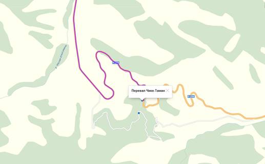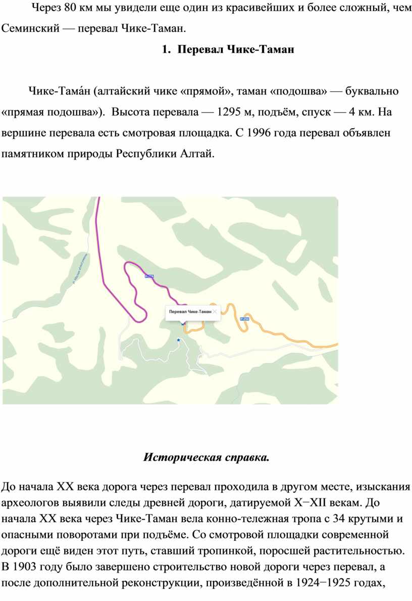 Чике-Тама́н (алтайский чике «прямой», таман «подошва» — буквально «прямая подошва»). Высота перевала — 1295 м, подъём, спуск — 4 км. На вершине перевала есть смотровая площадка. С 1996 года перевал объявлен памятником природы Республики Алтай.