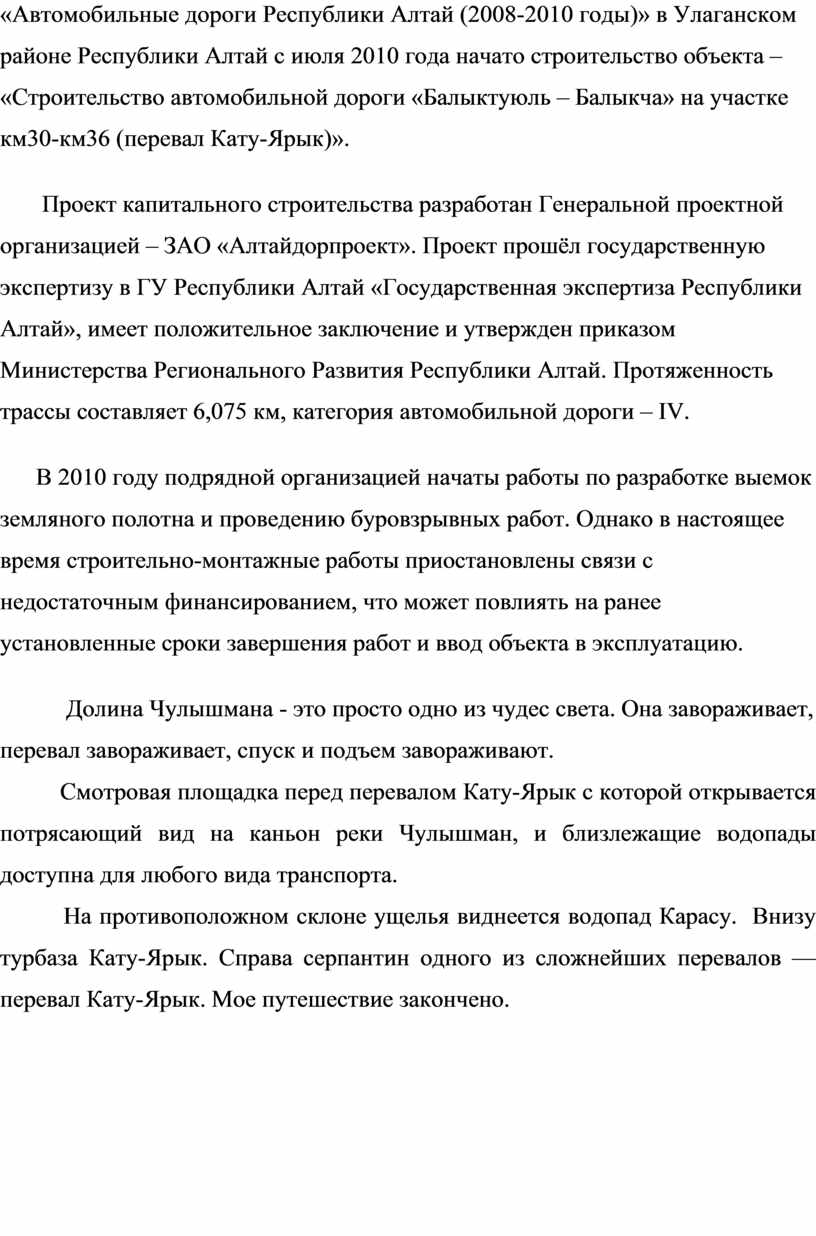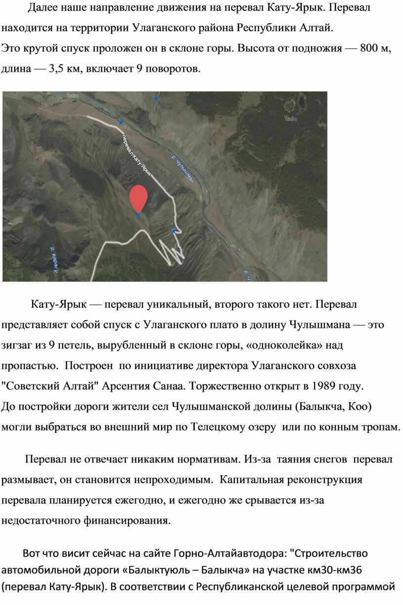 Вот что висит сейчас на сайте Горно-Алтайавтодора: "Строительство автомобильной дороги «Балыктуюль – Балыкча» на участке км30-км36 (перевал Кату-Ярык). В соответствии с Республиканской целевой программой «Автомобильные дороги Республики Алтай (2008-2010 годы)» в Улаганском районе Республики Алтай с июля 2010 года начато строительство объекта – «Строительство автомобильной дороги «Балыктуюль – Балыкча» на участке км30-км36 (перевал Кату-Ярык)».