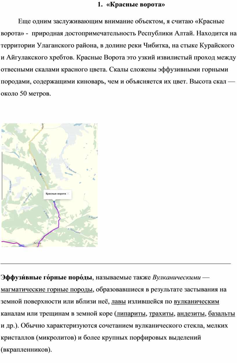 Еще одним заслуживающим внимание объектом, я считаю «Красные ворота» - природная достопримечательность Республики Алтай. Находится на территории Улаганского района, в долине реки Чибитка, на стыке Курайского и Айгулакского хребтов. Красные Ворота это узкий извилистый проход между отвесными скалами красного цвета. Скалы сложены эффузивными горными породами, содержащими киноварь, чем и объясняется их цвет. Высота скал — около 50 метров.