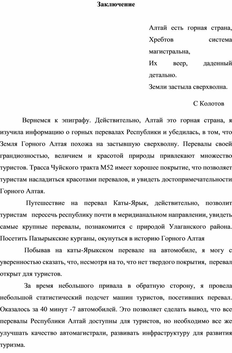 Вернемся к эпиграфу. Действительно, Алтай это горная страна, я изучила информацию о горных перевалах Республики и убедилась, в том, что Земля Горного Алтая похожа на застывшую сверхволну. Перевалы своей грандиозностью, величием и красотой природы привлекают множество туристов. Трасса Чуйского тракта М52 имеет хорошее покрытие, что позволяет туристам насладиться красотами перевалов, и увидеть достопримечательности Горного Алтая.