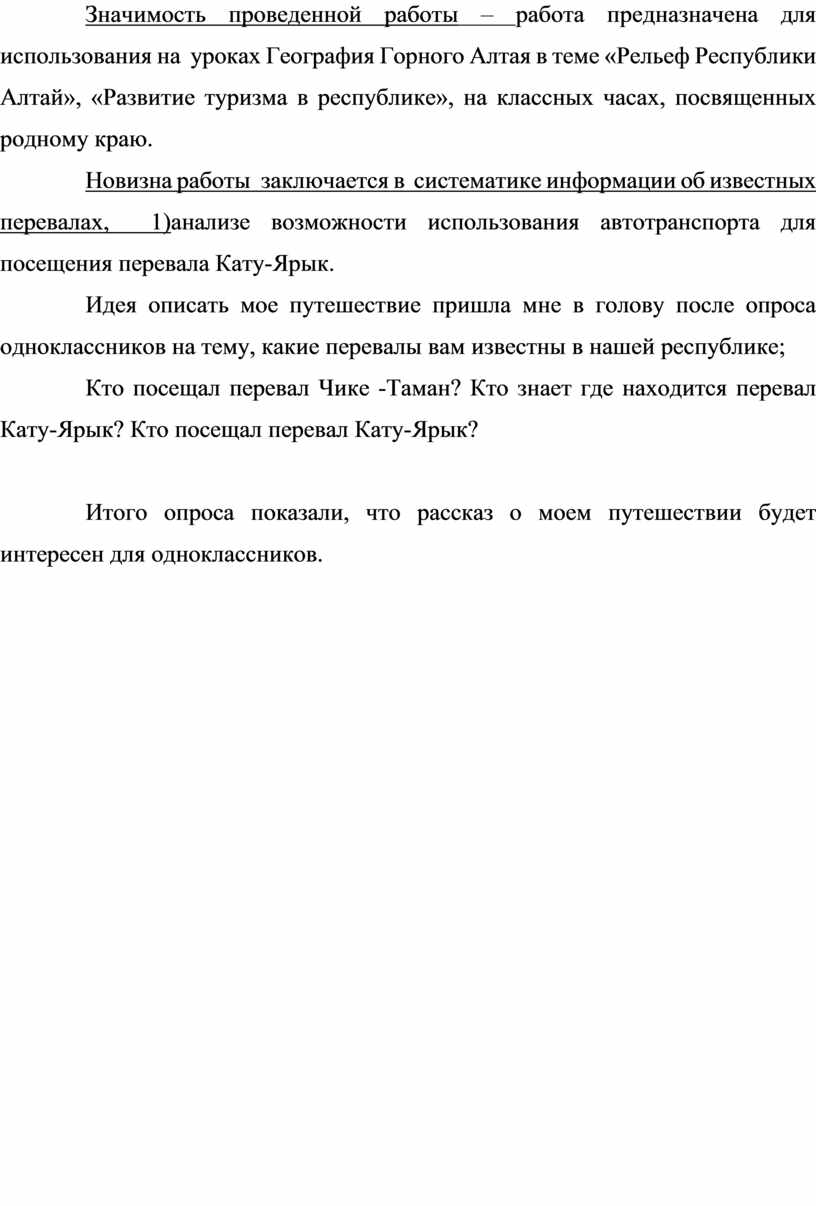 Значимость проведенной работы – работа предназначена для использования на уроках География Горного Алтая в теме «Рельеф Республики Алтай», «Развитие туризма в республике», на классных часах, посвященных родному краю.