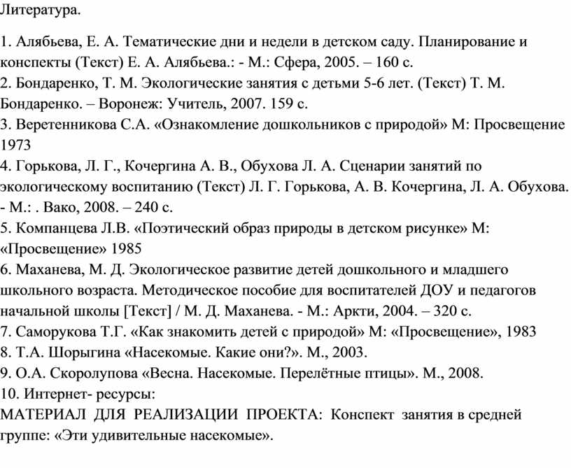 2. Бондаренко, Т. М. Экологические занятия с детьми 5-6 лет. (Текст) Т. М. Бондаренко. – Воронеж: Учитель, 2007. 159 с.