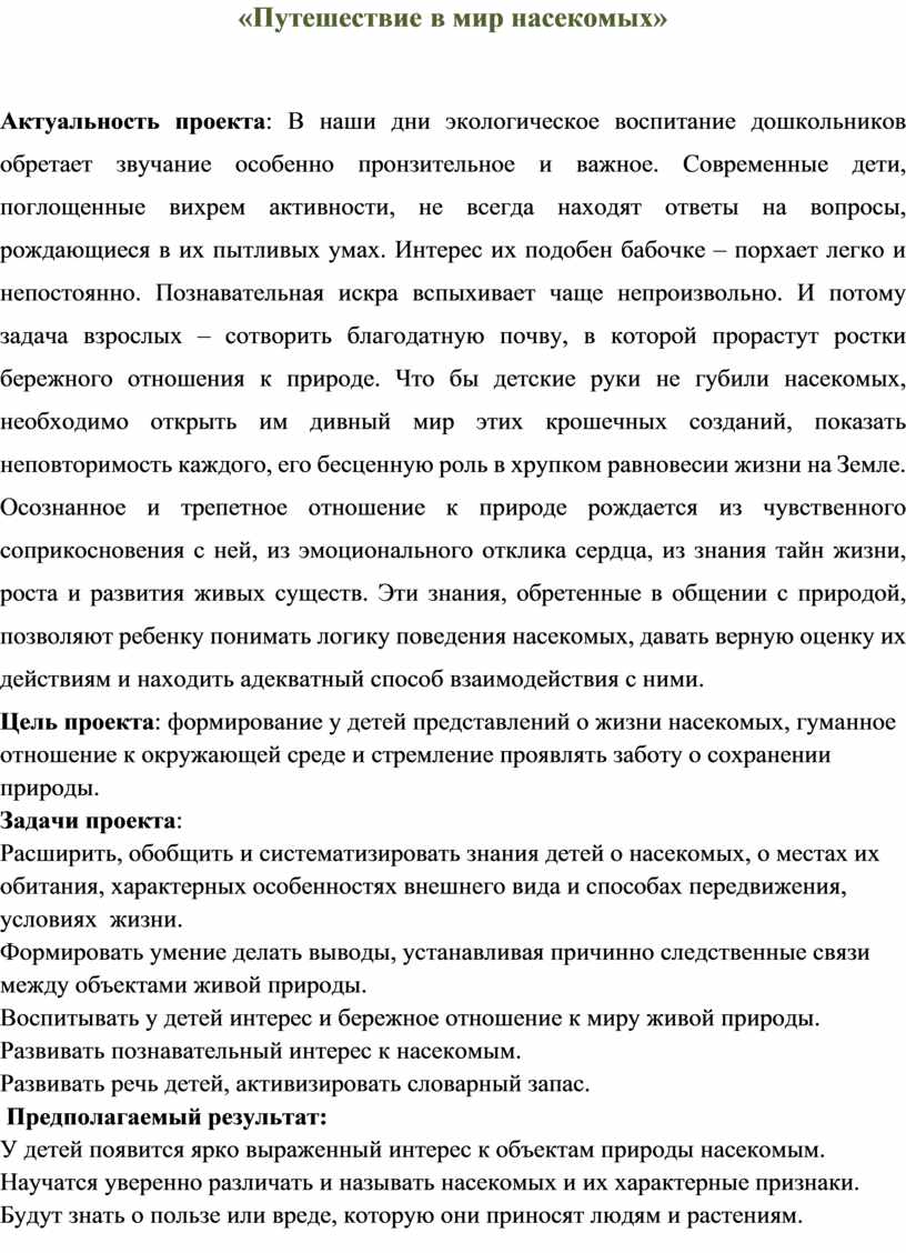 Актуальность проекта: В наши дни экологическое воспитание дошкольников обретает звучание особенно пронзительное и важное. Современные дети, поглощенные вихрем активности, не всегда находят ответы на вопросы, рождающиеся в их пытливых умах. Интерес их подобен бабочке – порхает легко и непостоянно. Познавательная искра вспыхивает чаще непроизвольно. И потому задача взрослых – сотворить благодатную почву, в которой прорастут ростки бережного отношения к природе. Что бы детские руки не губили насекомых, необходимо открыть им дивный мир этих крошечных созданий, показать неповторимость каждого, его бесценную роль в хрупком равновесии жизни на Земле.