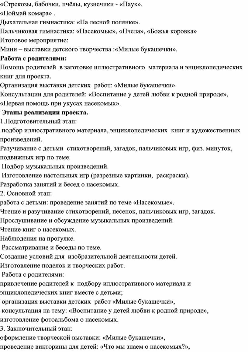 Подбор иллюстративного материала по теме, разработка занятий, картотека дидактических игр, подбор стихов и загадок о насекомых, рассказ детьми о каком-либо насекомом по схеме, фотографии досугов, выставка детских работ «Милые букашечки», коллаж: «Эти удивительные насекомые», викторина: «Что мы знаем о насекомых», консультация для родителей.