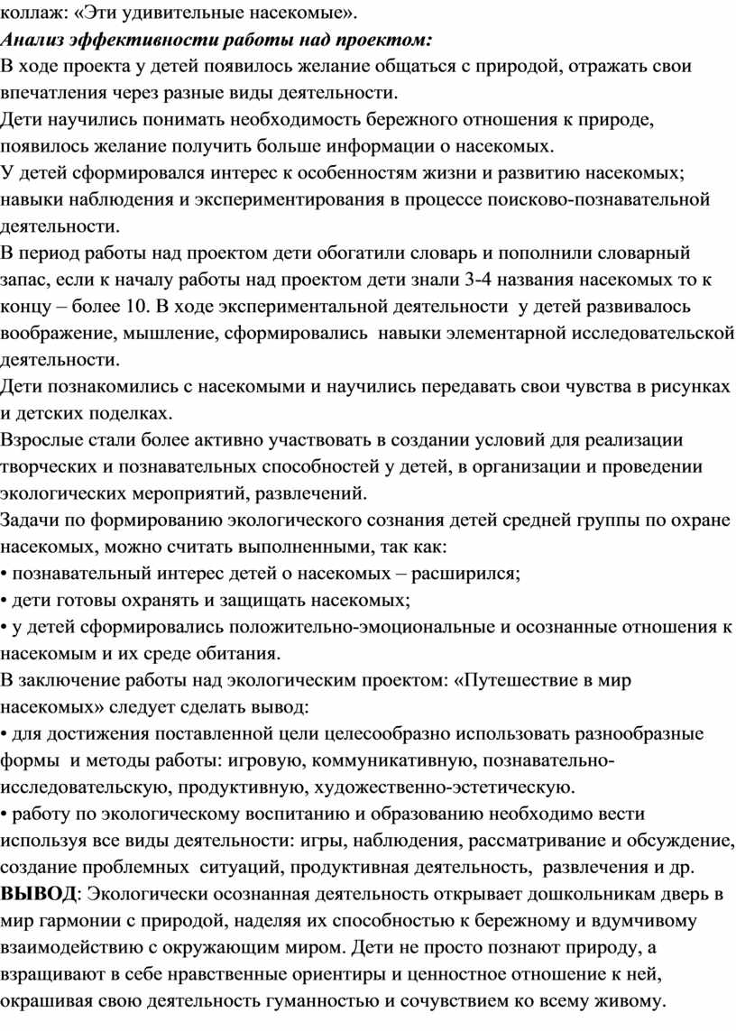 В заключение работы над экологическим проектом: «Путешествие в мир насекомых» следует сделать вывод: