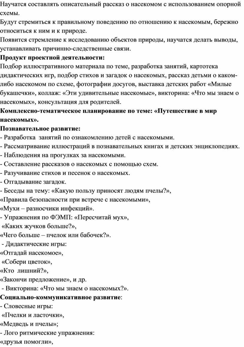 У детей появится ярко выраженный интерес к объектам природы насекомым. Научатся уверенно различать и называть насекомых и их характерные признаки. Будут знать о пользе или вреде, которую они приносят людям и растениям. Научатся составлять описательный рассказ о насекомом с использованием опорной схемы.