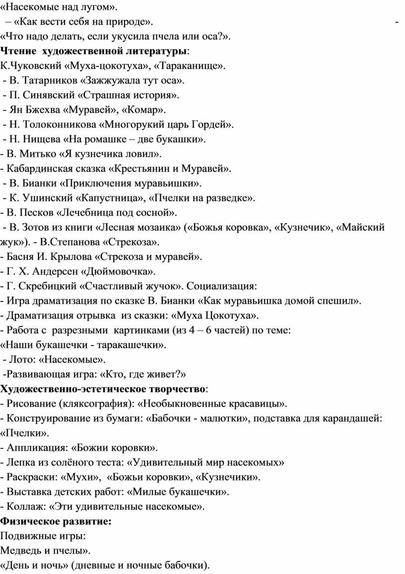 Познавательное развитие: - Разработка занятий по ознакомлению детей с насекомыми. - Рассматривание иллюстраций в познавательных книгах и детских энциклопедиях. - Наблюдения на прогулках за насекомыми. - Составление рассказов о насекомых с помощью схем. - Разучивание стихов и песенок о насекомых. - Отгадывание загадок. - Беседы на тему: «Какую пользу приносят людям пчелы?»,