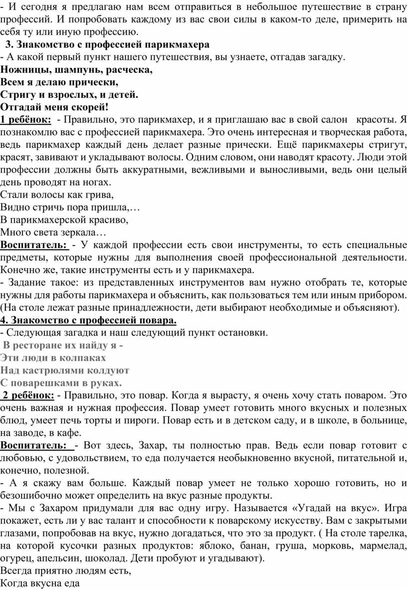 1 ребёнок: - Правильно, это парикмахер, и я приглашаю вас в свой салон красоты. Я познакомлю вас с профессией парикмахера. Это очень интересная и творческая работа, ведь парикмахер каждый день делает разные прически. Ещё парикмахеры стригут, красят, завивают и укладывают волосы. Одним словом, они наводят красоту. Люди этой профессии должны быть аккуратными, вежливыми и выносливыми, ведь они целый день проводят на ногах.