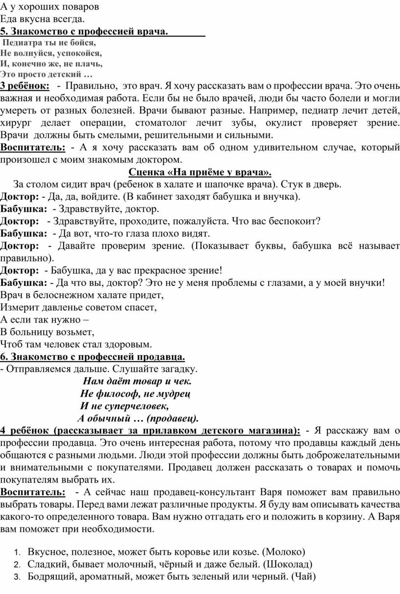 3 ребёнок: - Правильно, это врач. Я хочу рассказать вам о профессии врача. Это очень важная и необходимая работа. Если бы не было врачей, люди бы часто болели и могли умереть от разных болезней. Врачи бывают разные. Например, педиатр лечит детей, хирург делает операции, стоматолог лечит зубы, окулист проверяет зрение. Врачи должны быть смелыми, решительными и сильными.