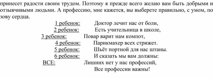 - Но самое главное, что мне хотелось бы вам сказать, это то, что можно быть кем угодно: прекрасным врачом, умелым парикмахером, знающим поваром, водителем, учителем, но если у человека злое сердце, если он завистлив и эгоистичен, такой человек не принесет радости своим трудом. Поэтому я прежде всего желаю вам быть добрыми и отзывчивыми людьми. А профессию, мне кажется, вы выберете правильно, с умом, по зову сердца.