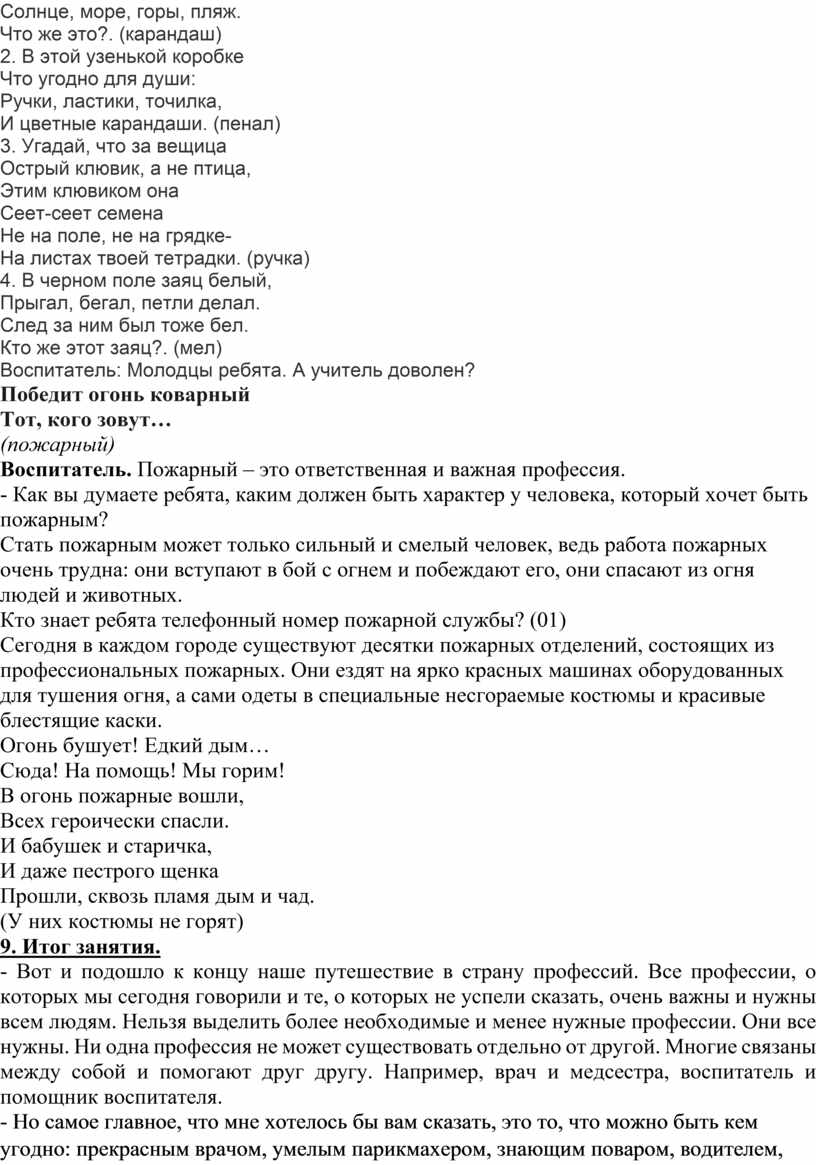 - Вот и подошло к концу наше путешествие в страну профессий. Все профессии, о которых мы сегодня говорили и те, о которых не успели сказать, очень важны и нужны всем людям. Нельзя выделить более необходимые и менее нужные профессии. Они все нужны. Ни одна профессия не может существовать отдельно от другой. Многие связаны между собой и помогают друг другу. Например, врач и медсестра, воспитатель и помощник воспитателя.