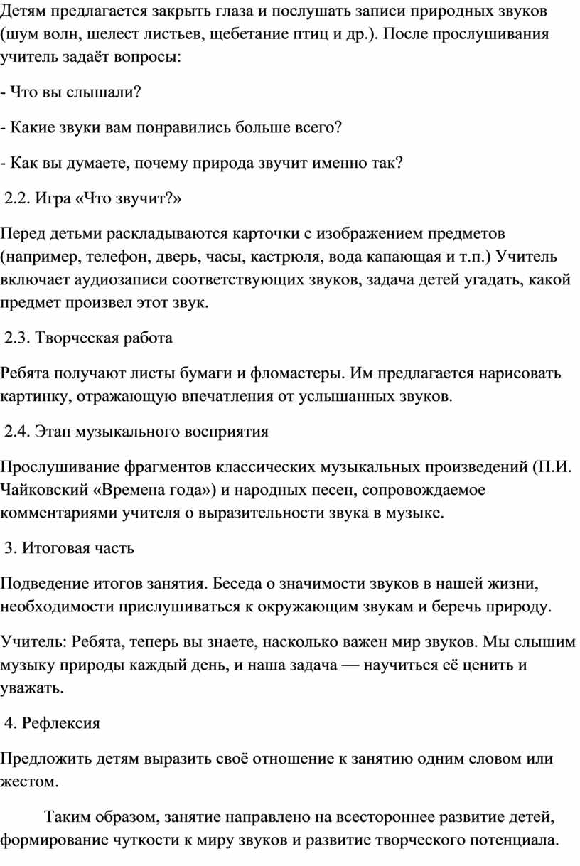 Таким образом, занятие направлено на всестороннее развитие детей, формирование чуткости к миру звуков и развитие творческого потенциала.