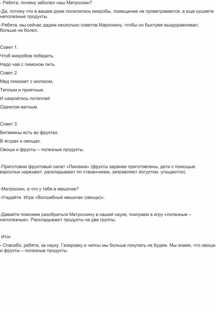-Давайте поможем разобраться Матроскину в нашей науке, поиграем в игру «полезные – неполезные». Раскладывают продукты на две группы.