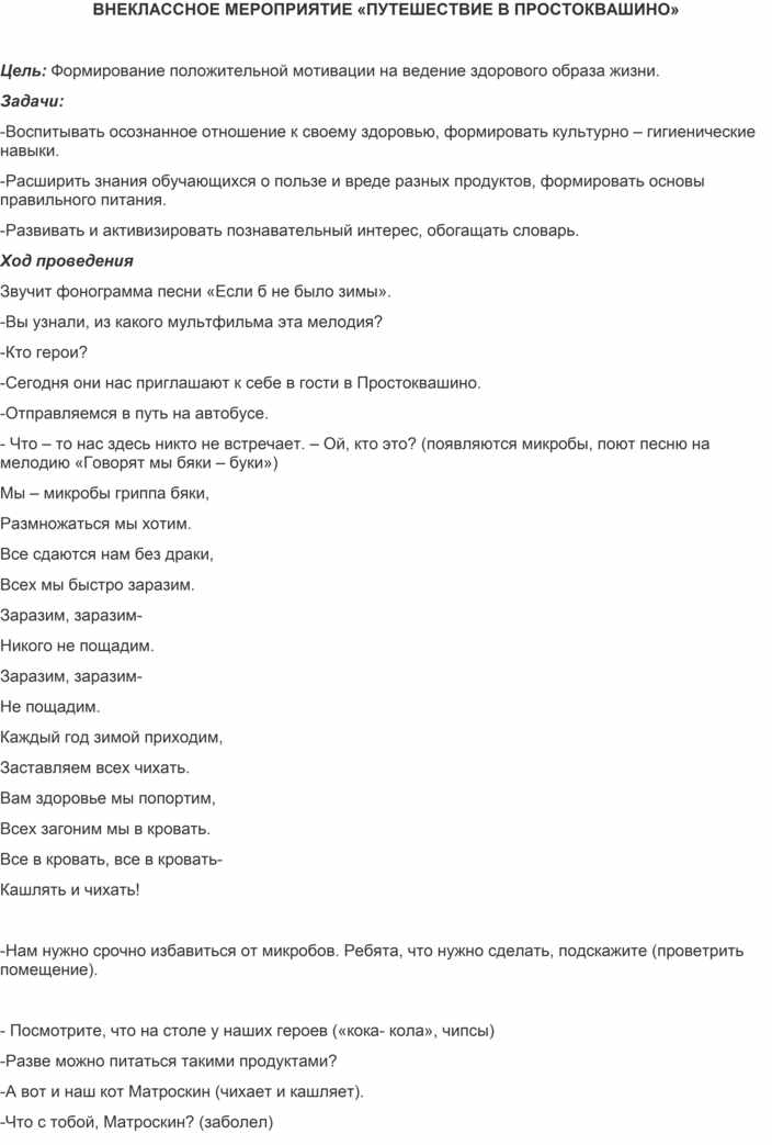 ВНЕКЛАССНОЕ МЕРОПРИЯТИЕ «ПУТЕШЕСТВИЕ В ПРОСТОКВАШИНО»