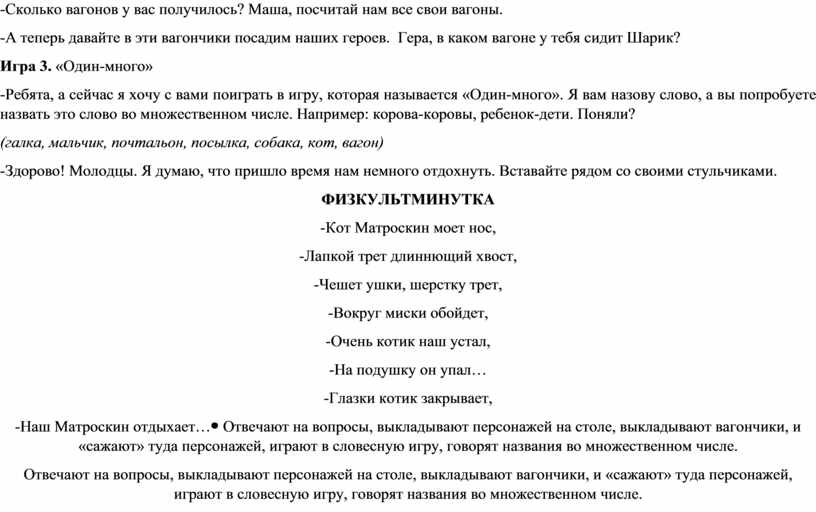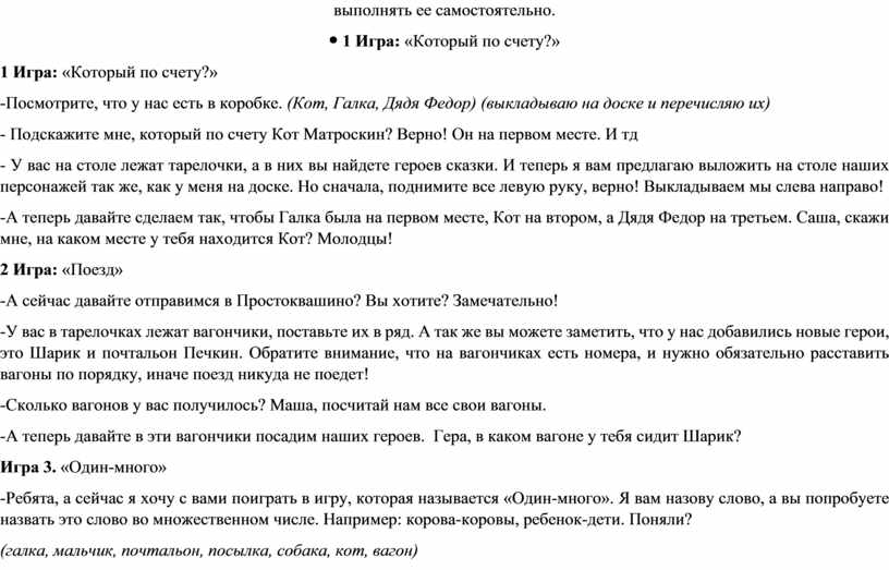 1 Игра: «Который по счету?» -Посмотрите, что у нас есть в коробке. (Кот, Галка, Дядя Федор) (выкладываю на доске и перечисляю их) - Подскажите мне, который по счету Кот Матроскин? Верно! Он на первом месте. И тд - У вас на столе лежат тарелочки, а в них вы найдете героев сказки. И теперь я вам предлагаю выложить на столе наших персонажей так же, как у меня на доске. Но сначала, поднимите все левую руку, верно! Выкладываем мы слева направо! -А теперь давайте сделаем так, чтобы Галка была на первом месте, Кот на втором, а Дядя Федор на третьем. Саша, скажи мне, на каком месте у тебя находится Кот? Молодцы! 2 Игра: «Поезд» -А сейчас давайте отправимся в Простоквашино? Вы хотите? Замечательно! -У вас в тарелочках лежат вагончики, поставьте их в ряд. А так же вы можете заметить, что у нас добавились новые герои, это Шарик и почтальон Печкин. Обратите внимание, что на вагончиках есть номера, и нужно обязательно расставить вагоны по порядку, иначе поезд никуда не поедет! -Сколько вагонов у вас получилось? Маша, посчитай нам все свои вагоны. -А теперь давайте в эти вагончики посадим наших героев. Гера, в каком вагоне у тебя сидит Шарик? Игра 3. «Один-много» -Ребята, а сейчас я хочу с вами поиграть в игру, которая называется «Один-много». Я вам назову слово, а вы попробуете назвать это слово во множественном числе. Например: корова-коровы, ребенок-дети. Поняли? (галка, мальчик, почтальон, посылка, собака, кот, вагон) -Здорово! Молодцы. Я думаю, что пришло время нам немного отдохнуть. Вставайте рядом со своими стульчиками. ФИЗКУЛЬТМИНУТКА -Кот Матроскин моет нос, -Лапкой трет длиннющий хвост, -Чешет ушки, шерстку трет, -Вокруг миски обойдет, -Очень котик наш устал, -На подушку он упал… -Глазки котик закрывает, -Наш Матроскин отдыхает… |