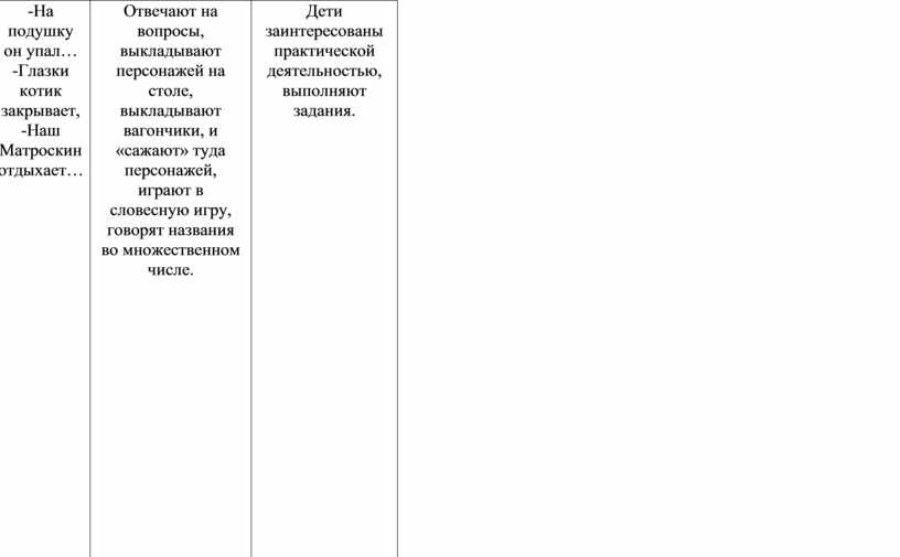 Отвечают на вопросы, выкладывают персонажей на столе, выкладывают вагончики, и «сажают» туда персонажей, играют в словесную игру, говорят названия во множественном числе.