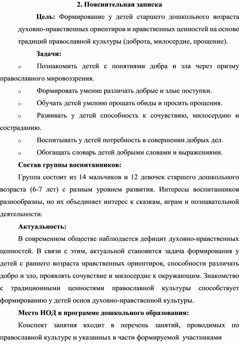 Цель: Формирование у детей старшего дошкольного возраста духовно-нравственных ориентиров и нравственных ценностей на основе традиций православной культуры (доброта, милосердие, прощение).