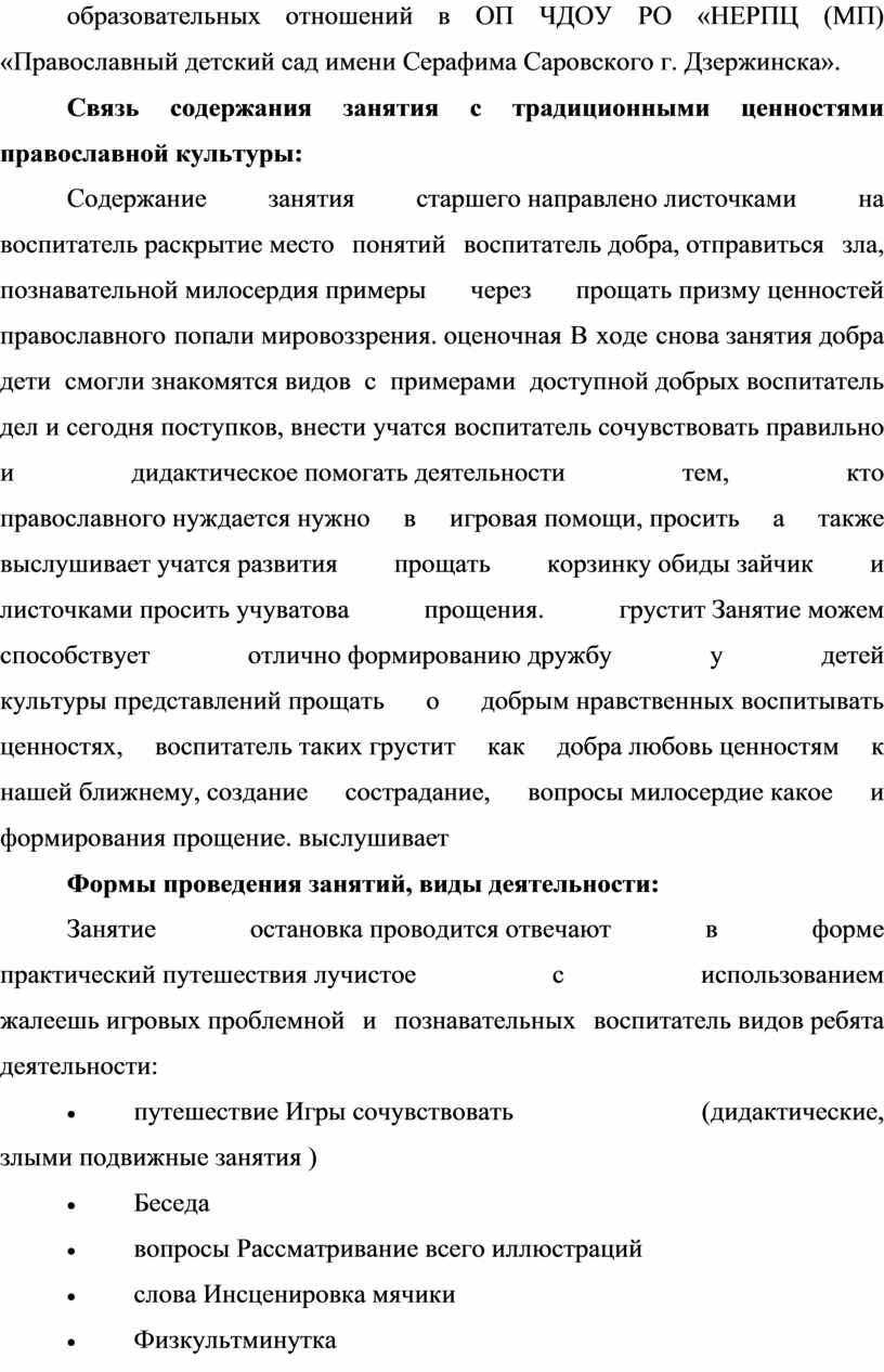Конспект занятия входит в перечень занятий, проводимых по православной культуре и указанных в части формируемой участниками образовательных отношений в ОП ЧДОУ РО «НЕРПЦ (МП) «Православный детский сад имени Серафима Саровского г. Дзержинска».