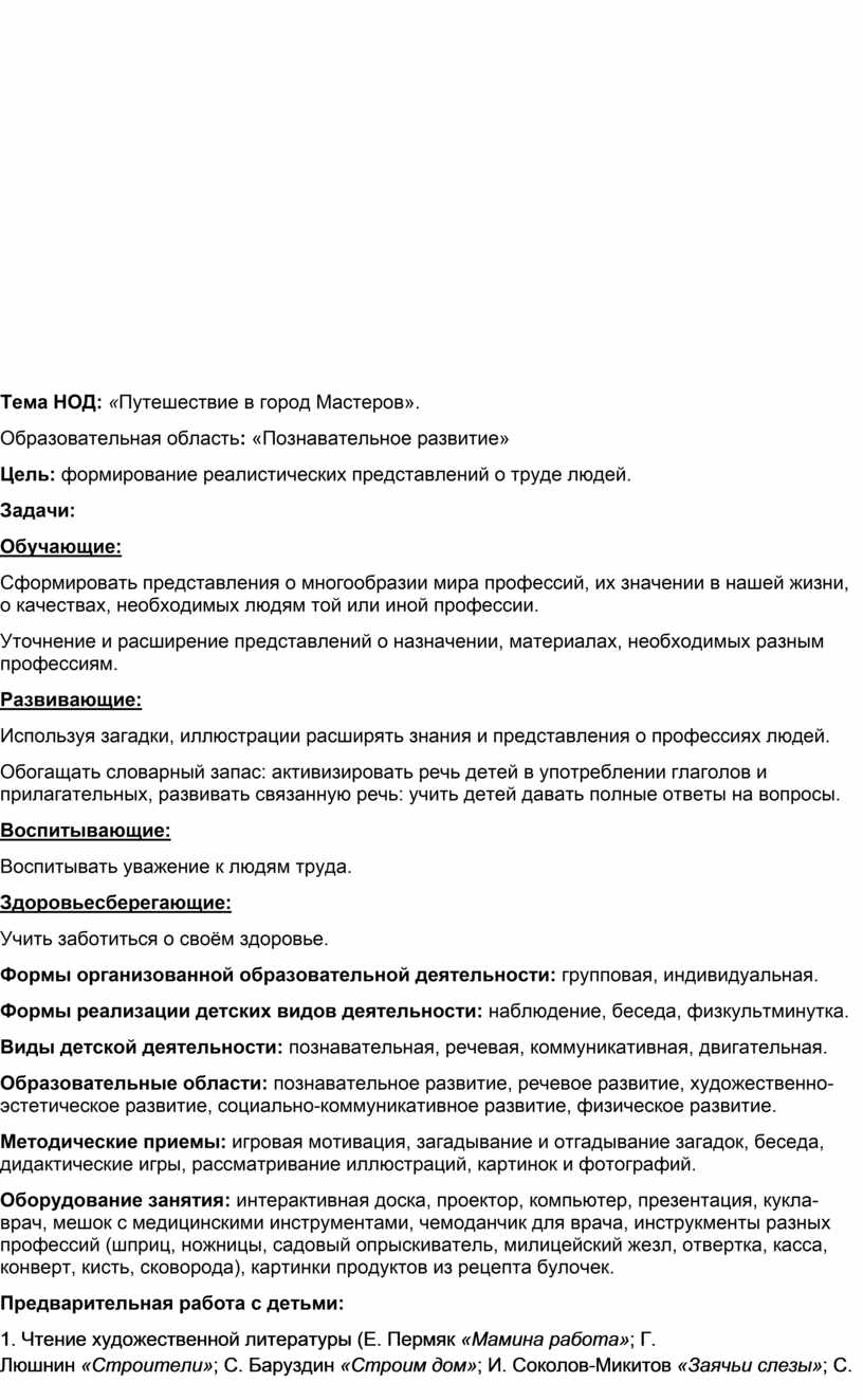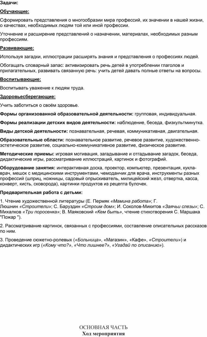Образовательные: познакомить детей с несколькими видами профессий, показать значение трудовой деятельности в жизни человека; уточнить, обобщить и расширить знания детей об особенностях некоторых профессий.