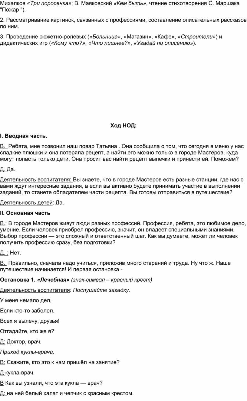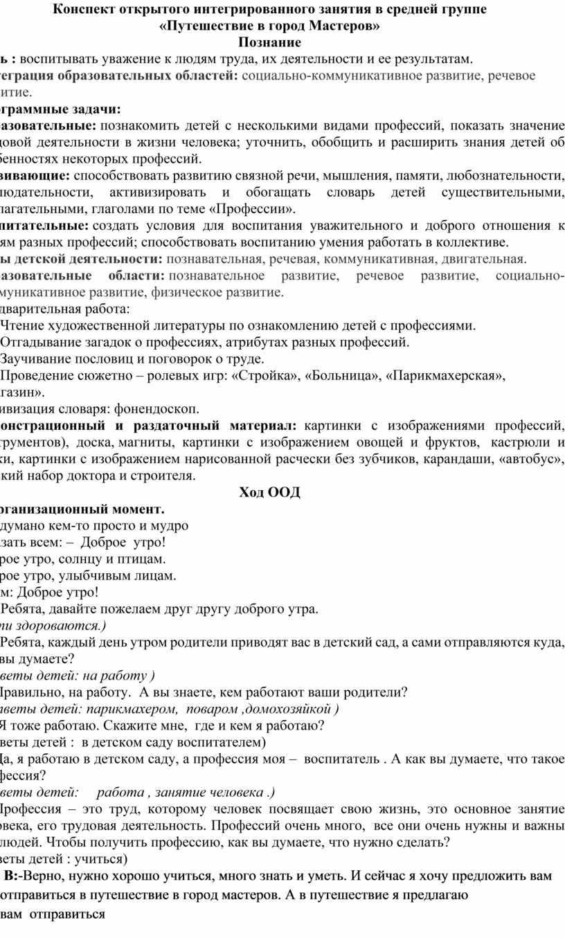Демонстрационный и раздаточный материал: картинки с изображениями профессий, инструментов), доска, магниты, картинки с изображением овощей и фруктов, кастрюли и банки, картинки с изображением нарисованной расчески без зубчиков, карандаши, «автобус», детский набор доктора и строителя.