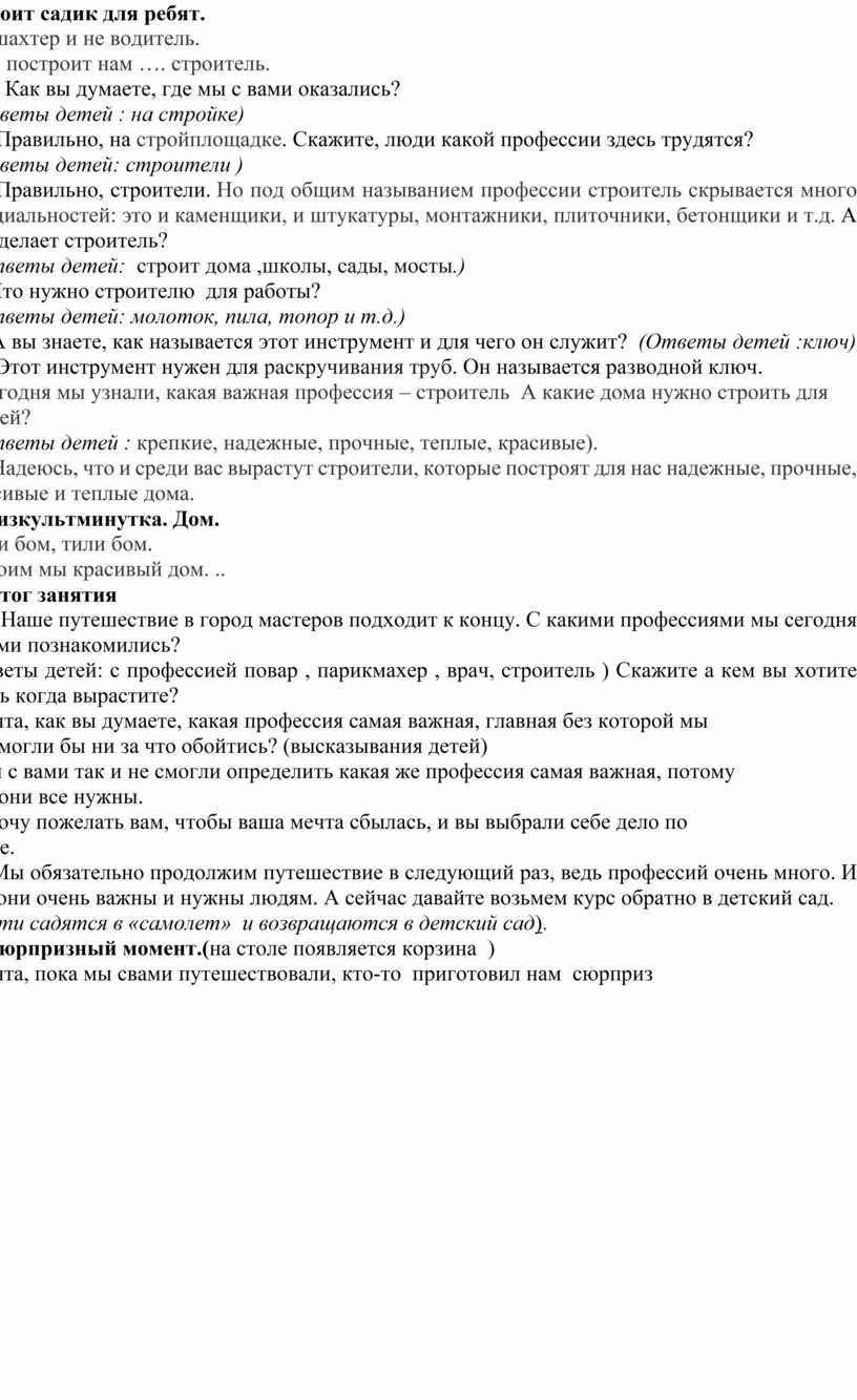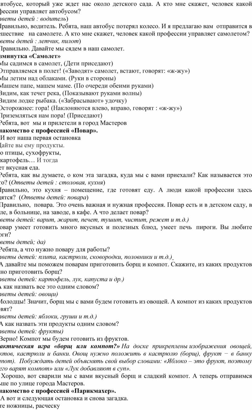 В:-Верно, нужно хорошо учиться, много знать и уметь. И сейчас я хочу предложить вам отправиться в путешествие в город мастеров. А в путешествие я предлагаю вам отправиться на автобусе, который уже ждет нас около детского сада. А кто мне скажет, человек какой профессии управляет автобусом?