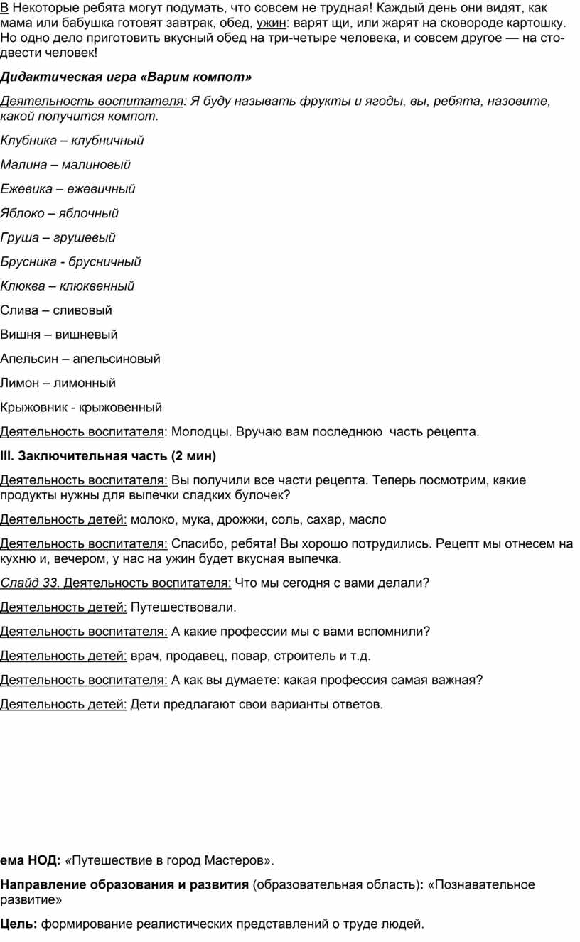 В:− Хорошо, вот сварили мы с вами вкусный борщ и сладкий компот. А теперь отправимся дальше по улице города Мастеров.