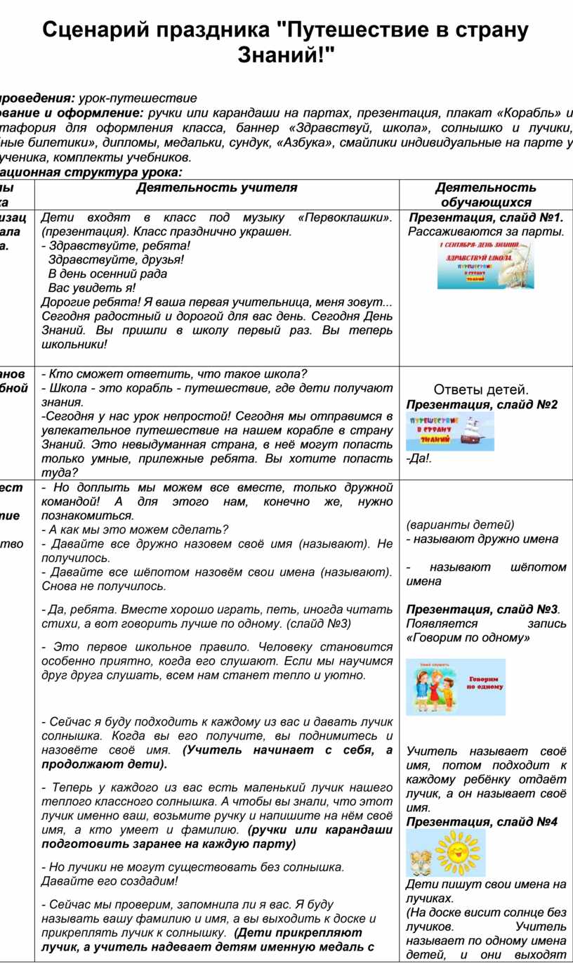 Дети входят в класс под музыку «Первоклашки». (презентация). Класс празднично украшен. - Здравствуйте, ребята! Здравствуйте, друзья! В день осенний рада Вас увидеть я! Дорогие ребята! Я ваша первая учительница, меня зовут... Сегодня радостный и дорогой для вас день. Сегодня День Знаний. Вы пришли в школу первый раз. Вы теперь школьники!
