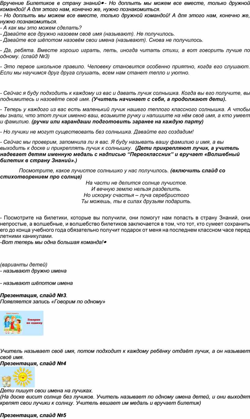 - Сейчас я буду подходить к каждому из вас и давать лучик солнышка. Когда вы его получите, вы поднимитесь и назовёте своё имя. (Учитель начинает с себя, а продолжают дети). - Теперь у каждого из вас есть маленький лучик нашего теплого классного солнышка. А чтобы вы знали, что этот лучик именно ваш, возьмите ручку и напишите на нём своё имя, а кто умеет и фамилию. (ручки или карандаши подготовить заранее на каждую парту) - Но лучики не могут существовать без солнышка. Давайте его создадим! - Сейчас мы проверим, запомнила ли я вас. Я буду называть вашу фамилию и имя, а вы выходить к доске и прикреплять лучик к солнышку. (Дети прикрепляют лучик, а учитель надевает детям именную медаль с надписью “Первоклассник” и вручает «Волшебный билетик в страну Знаний».) Посмотрите, какое лучистое солнышко у нас получилось. (включить слайд со стихотворением про солнце) На части не делится солнце лучистое. И вечную землю нельзя разделить. Но искорку счастья – луча серебристого Ты можешь, ты в силах друзьям подарить.
