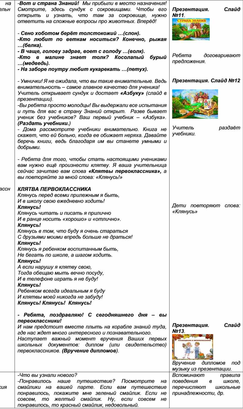 - Ребята для того, чтобы стать настоящими учениками вам нужно ещё произнести клятву. Я ваша учительница сейчас зачитаю вам слова «Клятвы первоклассника», а вы повторяйте за мной слова: «Клянусь!»