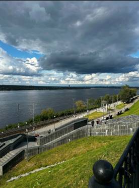 Рядом благоустроенный сквер с игровыми площадками, газонами, дорожками. Сквер подступает прямо к камскому берегу. Отсюда вид на реку и город никого не оставит равнодушным. Сюда приходят отдохнуть, сфотографироваться.