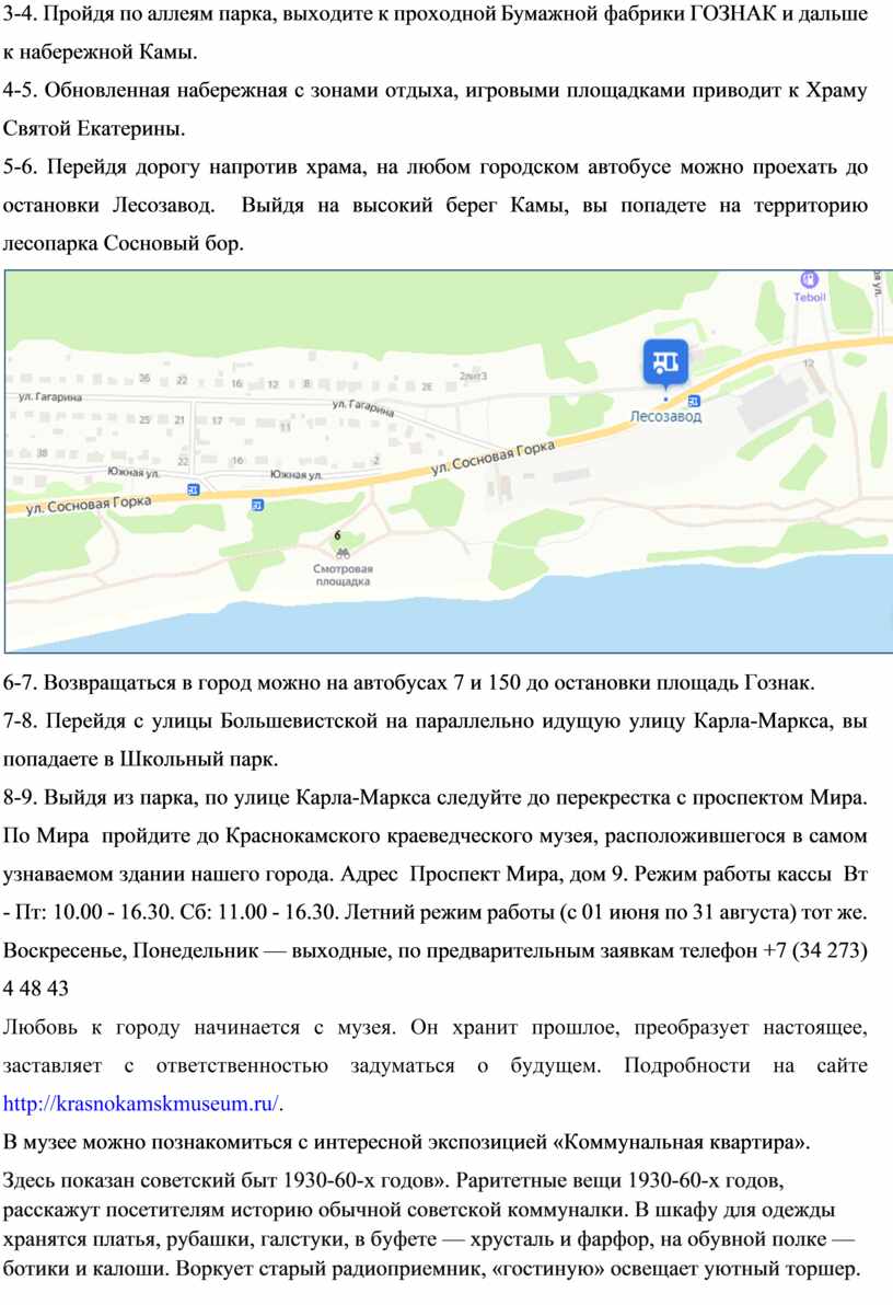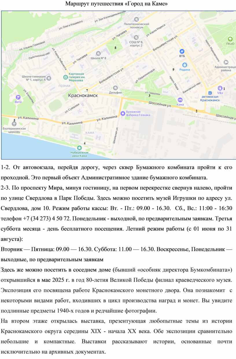 8-9. Выйдя из парка, по улице Карла-Маркса следуйте до перекрестка с проспектом Мира. По Мира пройдите до Краснокамского краеведческого музея, расположившегося в самом узнаваемом здании нашего города. Адрес Проспект Мира, дом 9. Режим работы кассы Вт - Пт: 10.00 - 16.30. Сб: 11.00 - 16.30. Летний режим работы (с 01 июня по 31 августа) тот же. Воскресенье, Понедельник — выходные, по предварительным заявкам телефон +7 (34 273) 4 48 43