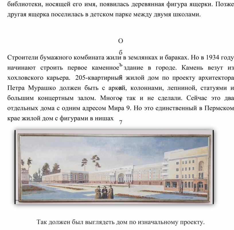 Строители бумажного комбината жили в землянках и бараках. Но в 1934 году начинают строить первое каменное здание в городе. Камень везут из хохловского карьера. 205-квартирный жилой дом по проекту архитектора Петра Мурашко должен быть с аркой, колоннами, лепниной, статуями и большим концертным залом. Многое так и не сделали. Сейчас это два отдельных дома с одним адресом Мира 9. Но это единственный в Пермском крае жилой дом с фигурами в нишах