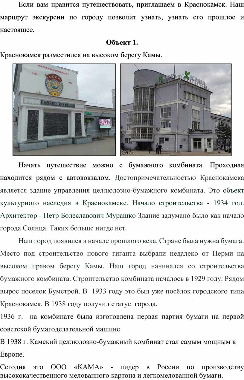 Начать путешествие можно с бумажного комбината. Проходная находится рядом с автовокзалом. Достопримечательностью Краснокамска является здание управления целлюлозно-бумажного комбината. Это объект культурного наследия в Краснокамске. Начало строительства - 1934 год. Архитектор - Петр Болеславович Мурашко Здание задумано было как начало города Солнца. Таких больше нигде нет.