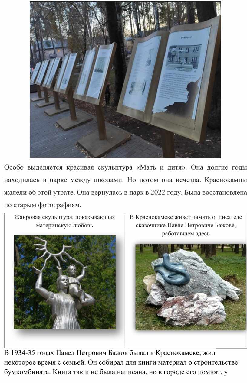 Особо выделяется красивая скульптура «Мать и дитя». Она долгие годы находилась в парке между школами. Но потом она исчезла. Краснокамцы жалели об этой утрате. Она вернулась в парк в 2022 году. Была восстановлена по старым фотографиям.