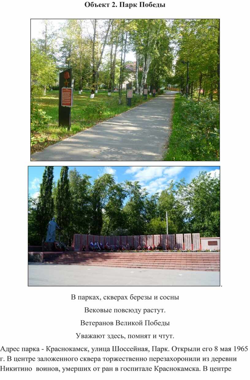 Адрес парка - Краснокамск, улица Шоссейная, Парк. Открыли его 8 мая 1965 г. В центре заложенного сквера торжественно перезахоронили из деревни Никитино воинов, умерших от ран в госпитале Краснокамска. В центре мемориал Победы в Великой Отечественной войне 1941-1945 годов и мемориал погибшим в Чечне, Афганистане и других локальных войнах, открытый в год 60-летия Победы. Вдоль центральной аллеи установлены памятные таблички о краснокамцах героях Советского союза.