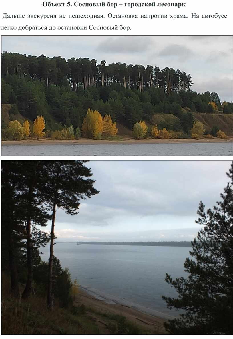 5-6. Перейдя дорогу напротив храма, на любом городском автобусе можно проехать до остановки Лесозавод. Выйдя на высокий берег Камы, вы попадете на территорию лесопарка Сосновый бор.