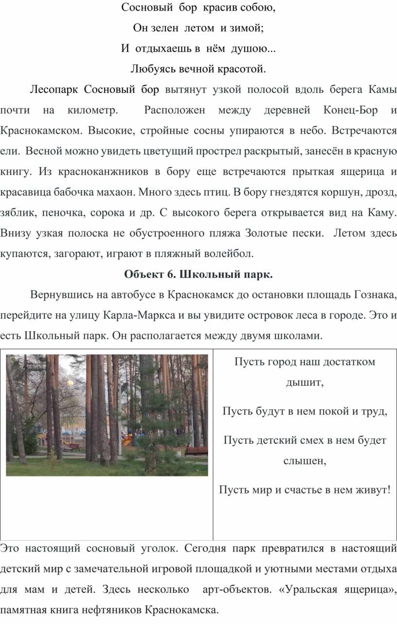 Лесопарк Сосновый бор вытянут узкой полосой вдоль берега Камы почти на километр. Расположен между деревней Конец-Бор и Краснокамском. Высокие, стройные сосны упираются в небо. Встречаются ели. Весной можно увидеть цветущий прострел раскрытый, занесён в красную книгу. Из красноканжников в бору еще встречаются прыткая ящерица и красавица бабочка махаон. Много здесь птиц. В бору гнездятся коршун, дрозд, зяблик, пеночка, сорока и др. С высокого берега открывается вид на Каму. Внизу узкая полоска не обустроенного пляжа Золотые пески. Летом здесь купаются, загорают, играют в пляжный волейбол.