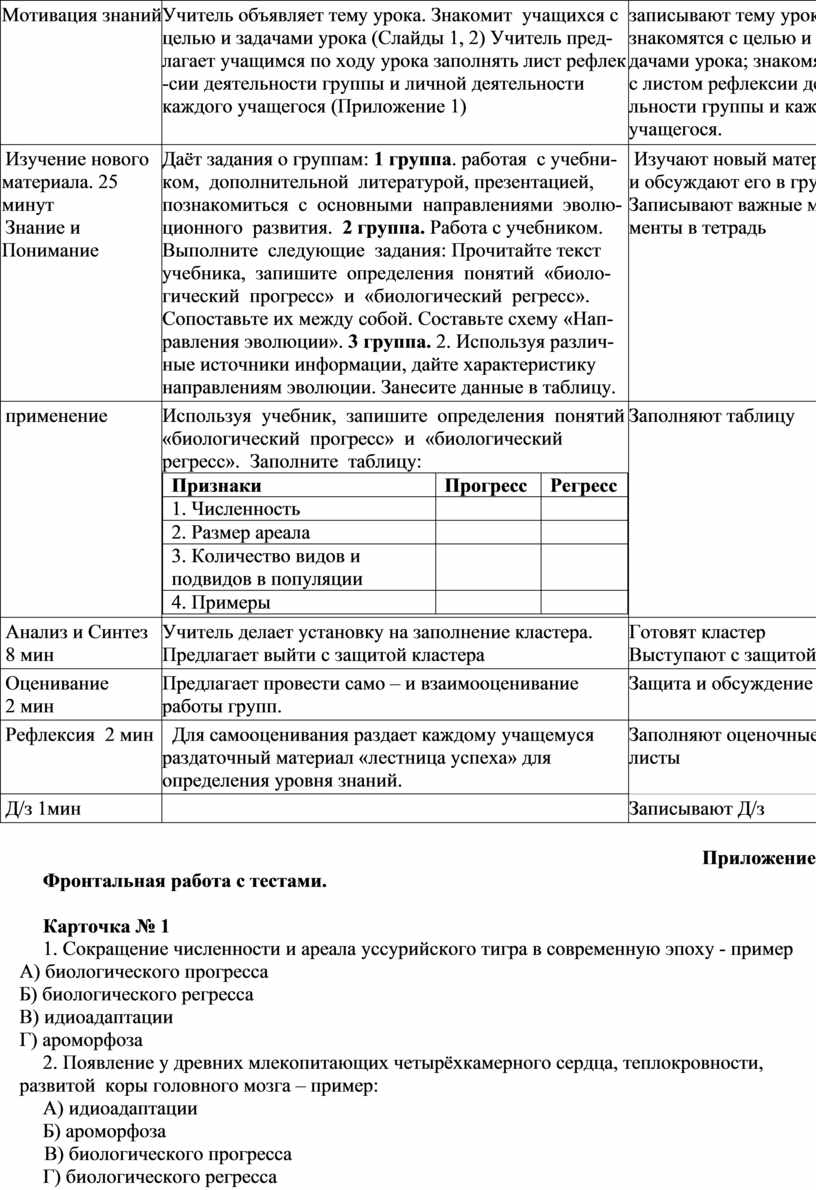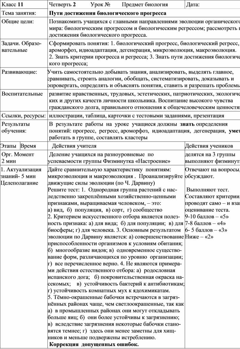 Сформировать понятия: 1. биологический прогресс, биологический регресс, ароморфоз, идиоадаптация, дегенерация, микроэволюция, макроэволюция. 2. Знать критерии прогресса и регресса; 3. Знать пути достижения биологичес-кого прогресса; |