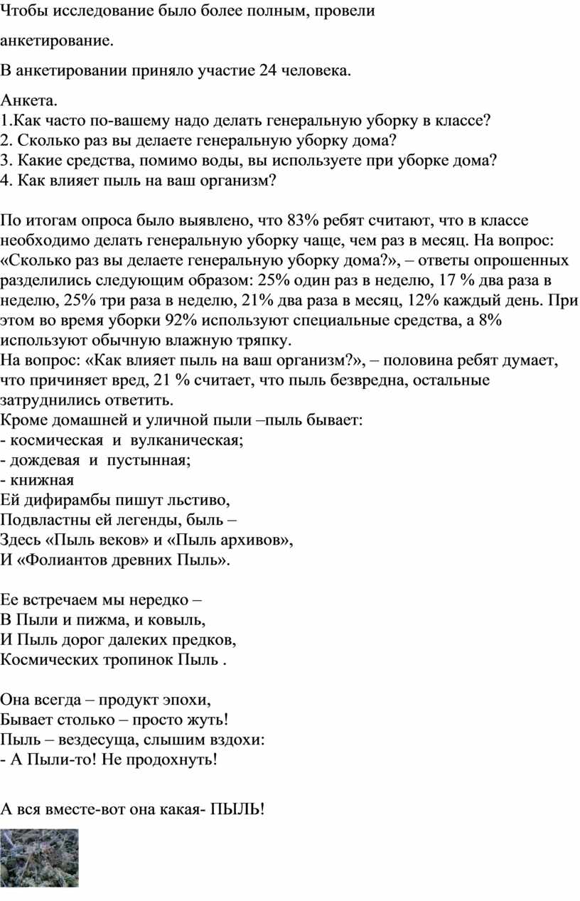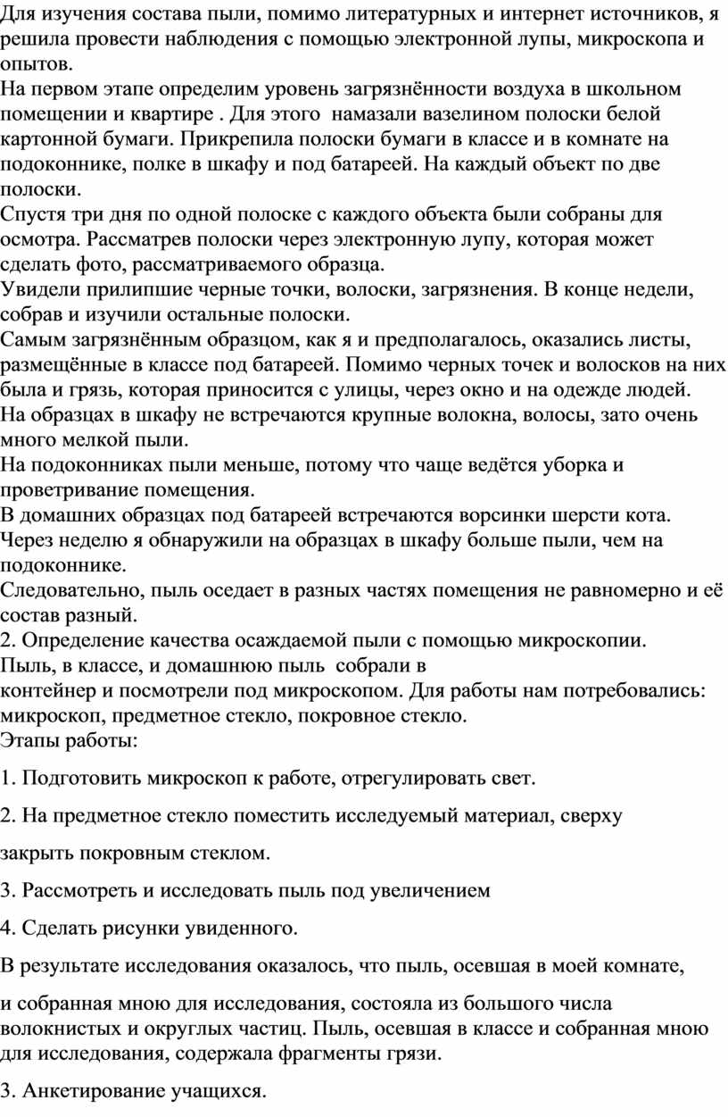 и собранная мною для исследования, состояла из большого числа волокнистых и округлых частиц. Пыль, осевшая в классе и собранная мною для исследования, содержала фрагменты грязи.