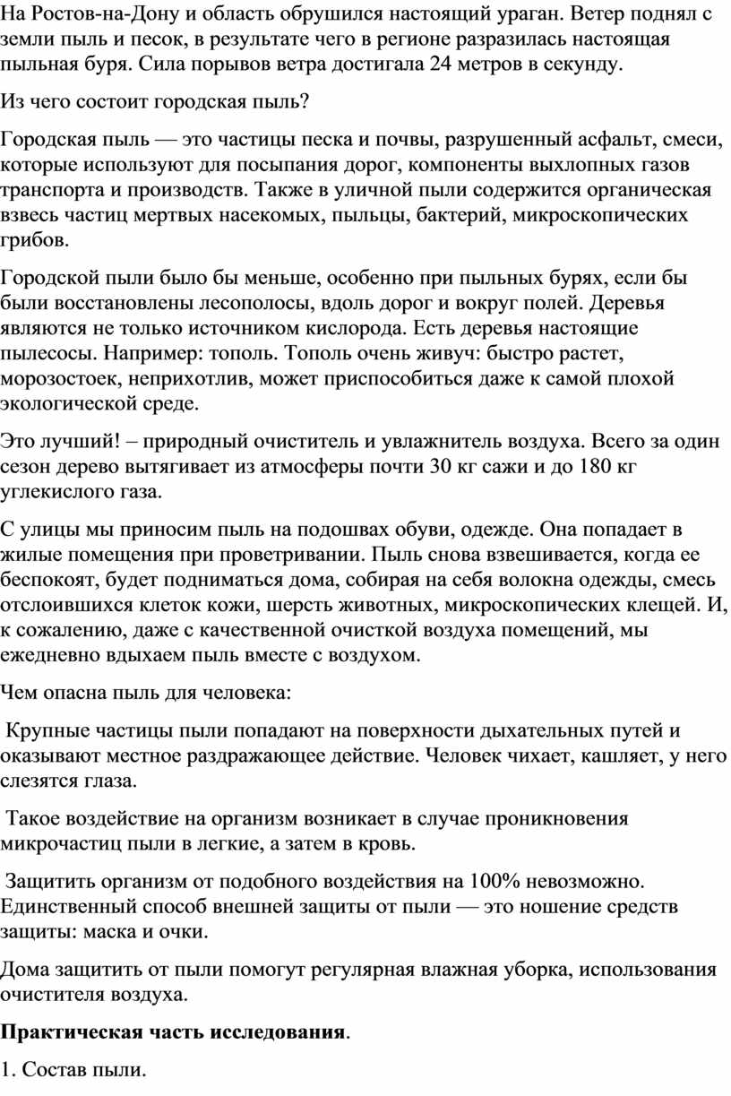Пыль в нашем городе — явление повсеместное. Особенно сильно пыль начинает тревожить горожан в весенне-летний период времени.