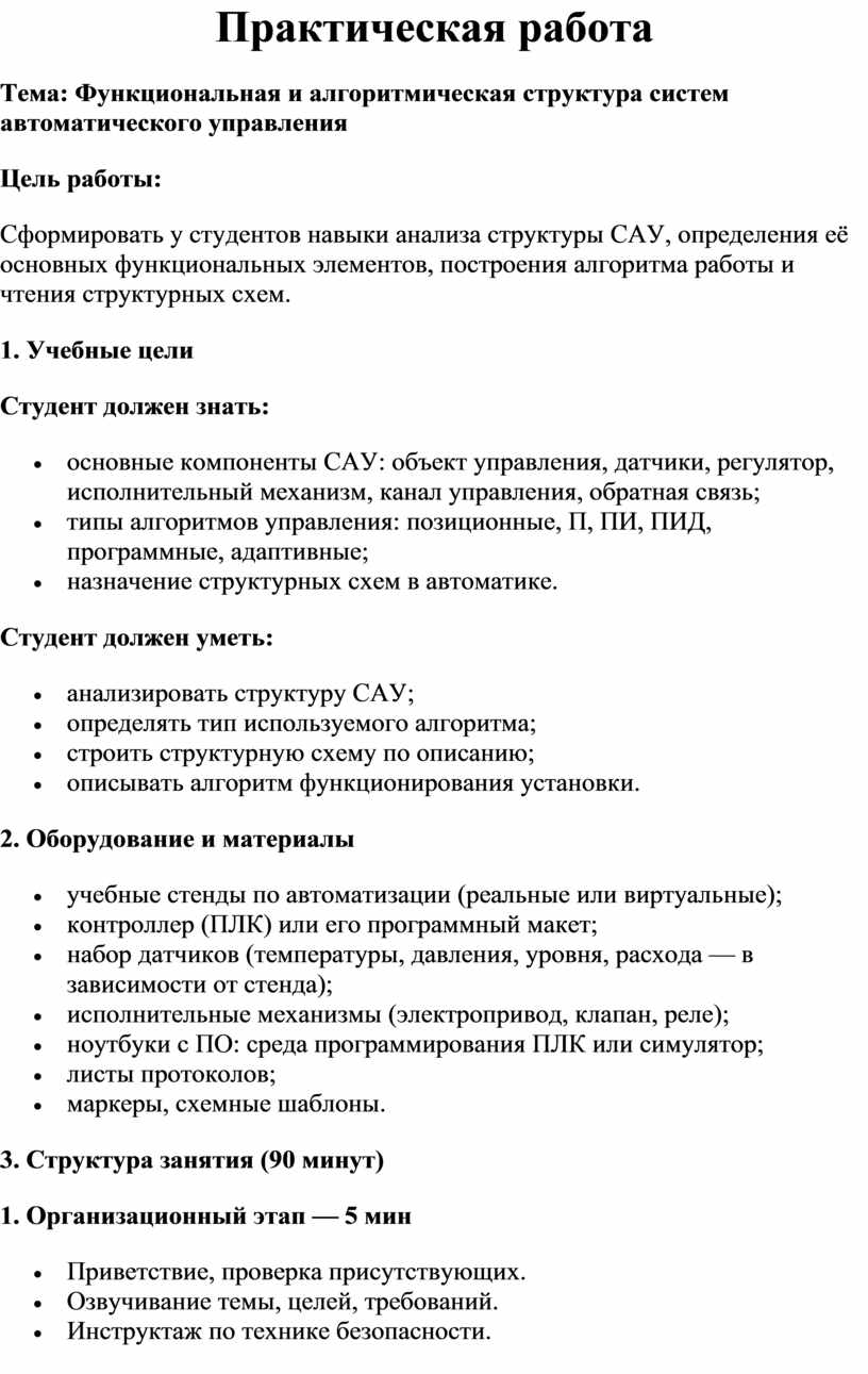 Сформировать у студентов навыки анализа структуры САУ, определения её основных функциональных элементов, построения алгоритма работы и чтения структурных схем.