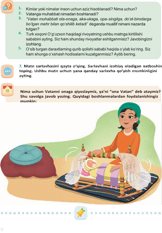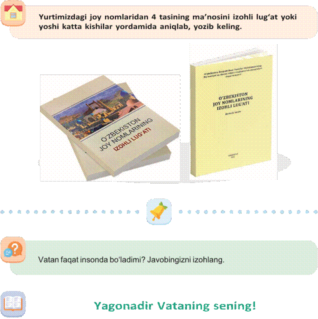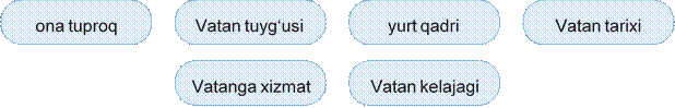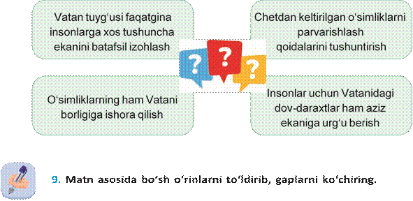 Yodingizda bo‘lsin, Vatan muhabbati ota-onaga, aka-ukaga, opa-singilga, do‘stbirodarga mehr bilan qo‘shilib ketadi. Nafaqat inson, hatto qushlar ham o‘z yurtini sog‘inadi. Dov-daraxtlar o‘z yurtini qo‘msaydi.