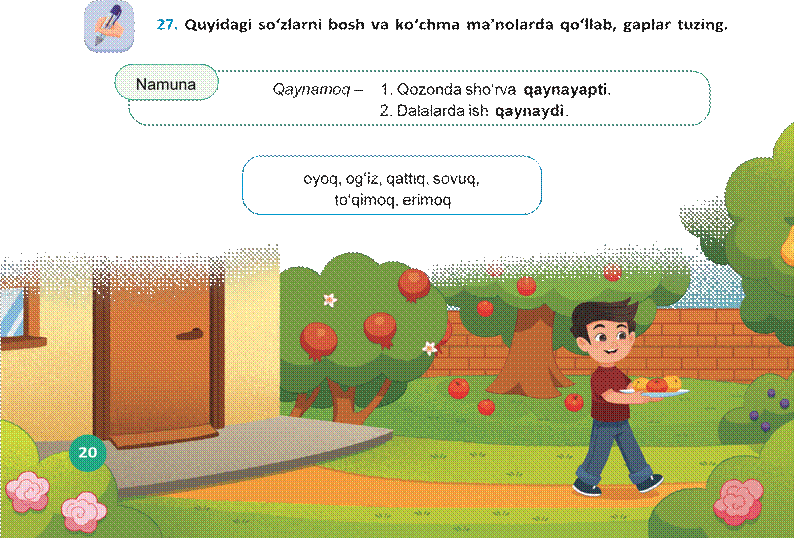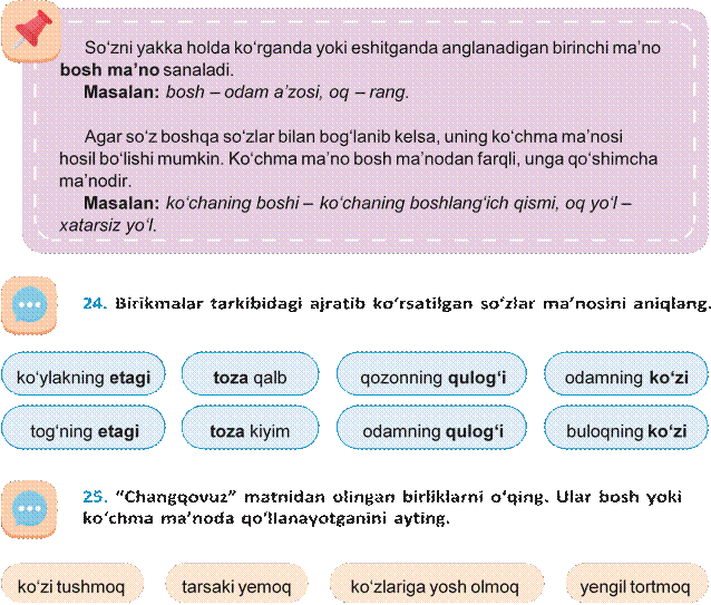 ko‘chma ma’noda qo‘llangan so‘zlarni toping. Ularni o‘z ma’nosida qo‘llab,