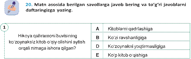 22. Matndan qahramonning buvisiga xos quyidagi sifatlar ifodalangan jumlalarni topib, daftaringizga yozing.